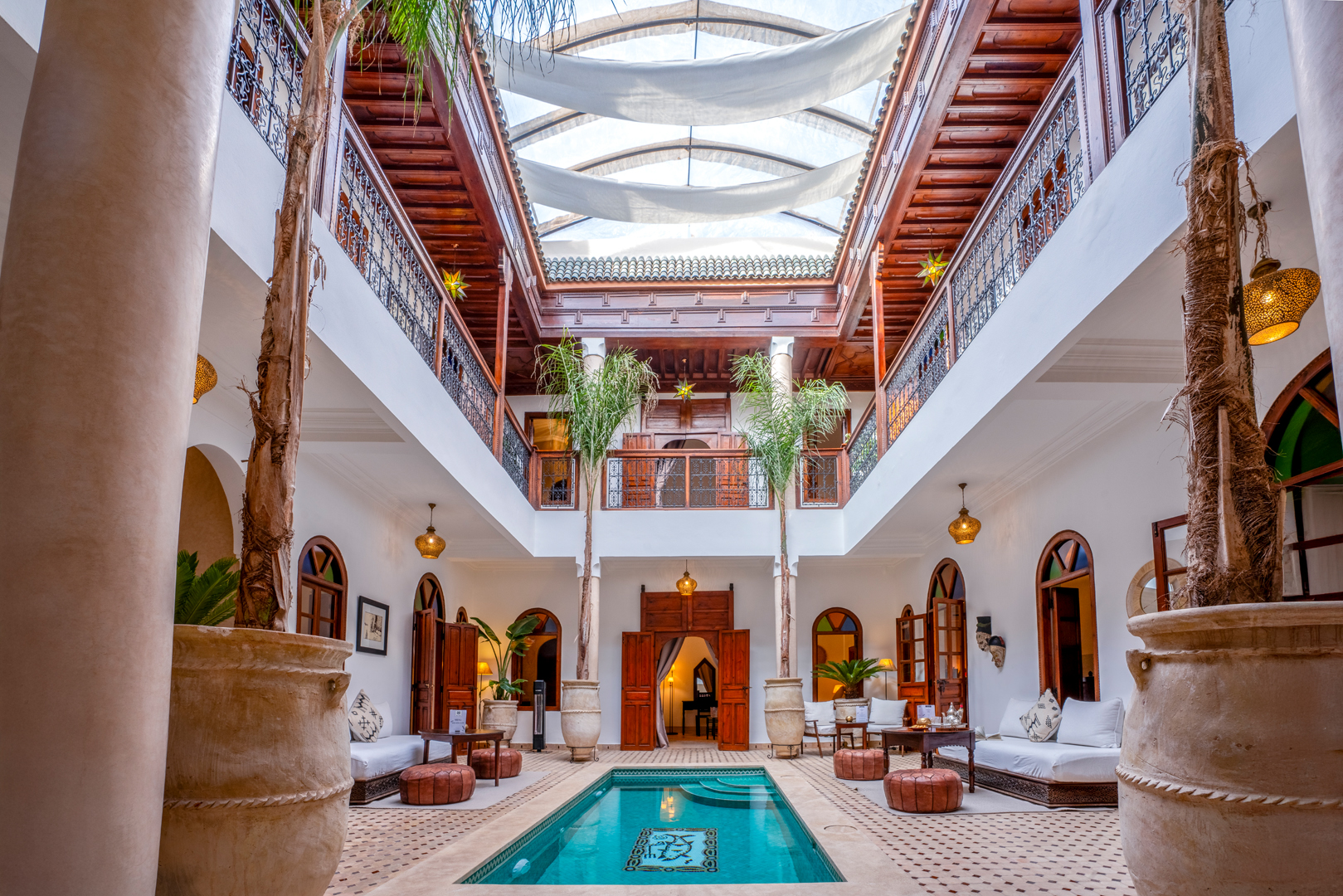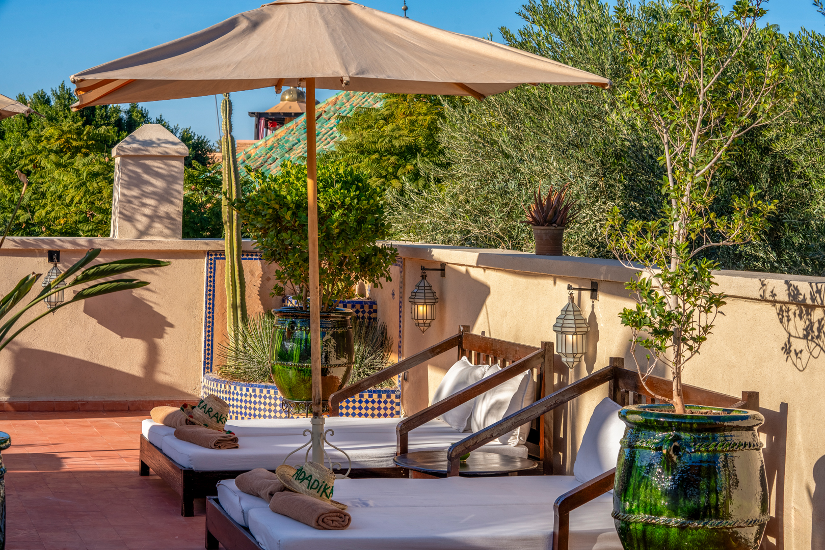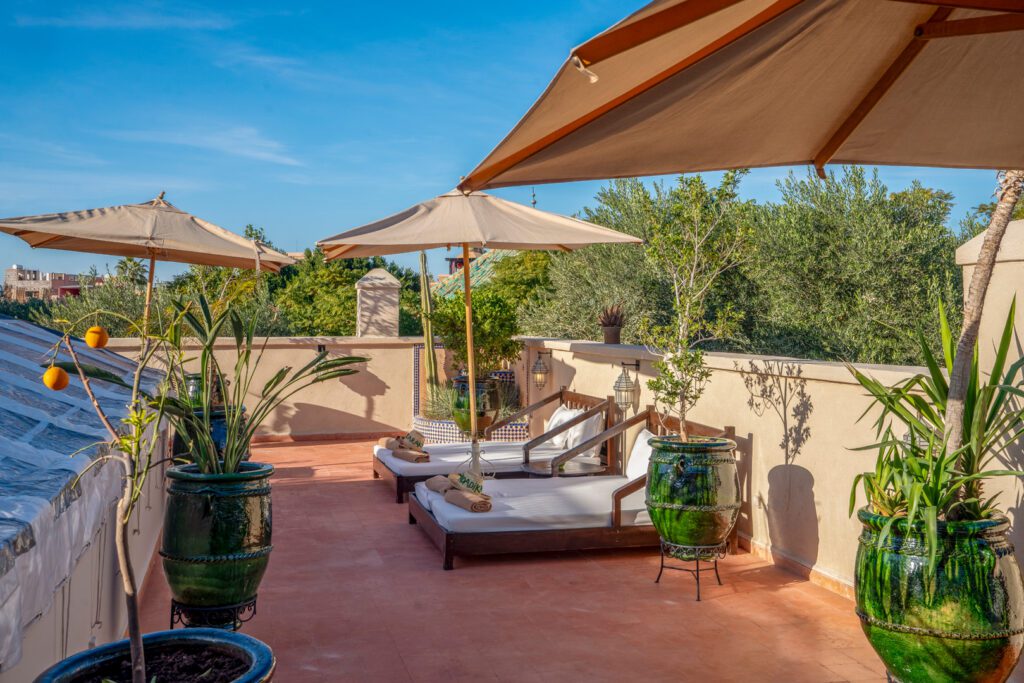 Plusieurs salons ombragés sous pergolas et un bar vous permettront de vous détendre et de déguster des cocktails de fruits fraîchement préparés. Un coin repas est également aménagé pour vos déjeuners et dîners sur les toits de Marrakech.